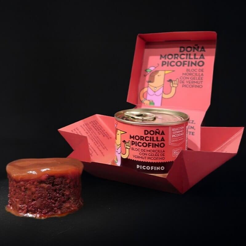 Este bloc se elabora de manera artesanal a partir de morcilla asturiana (68%), compuesta por tocino, cebolla, sangre de cerdo, pimentón, ajo y perejil, todo cuidadosamente condimentado y conservado para mantener su sabor auténtico. La gelée de vermut Picofino (32%) aporta un matiz dulce y especiado que eleva el conjunto a una categoría gastronómica superior.