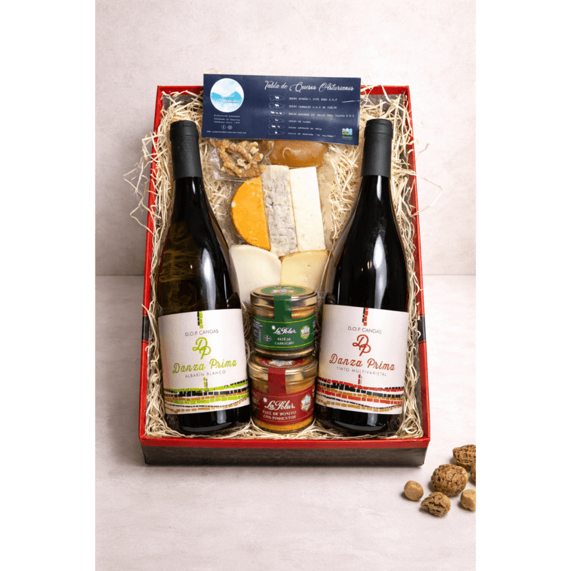 Para quien quiere regalar algo con fundamento: dos vinos DOP de una bodega asturiana pequeña, quesos con denominación de origen y conservas artesanas. Es un lote más orientado a los amantes del vino y la gastronomía que al picoteo informal — el blanco Albarín y el tinto Plurivarietal de Danza Prima son difíciles de encontrar fuera de Asturias.